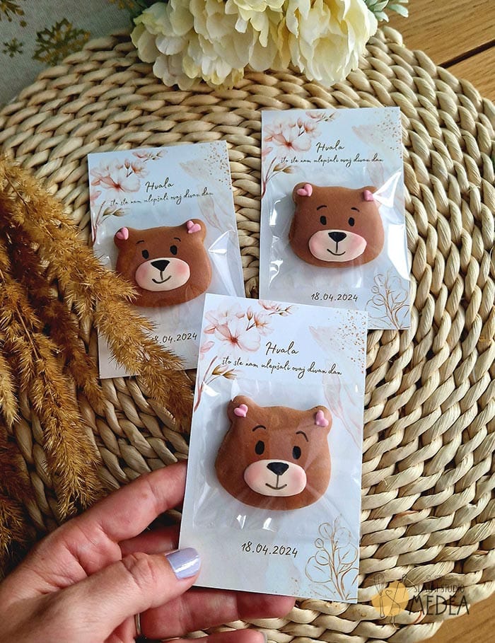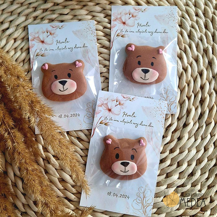 Svaki medenjak je zasebno spakovan u celofanskoj kesici i zalepljen na poklon kartici.